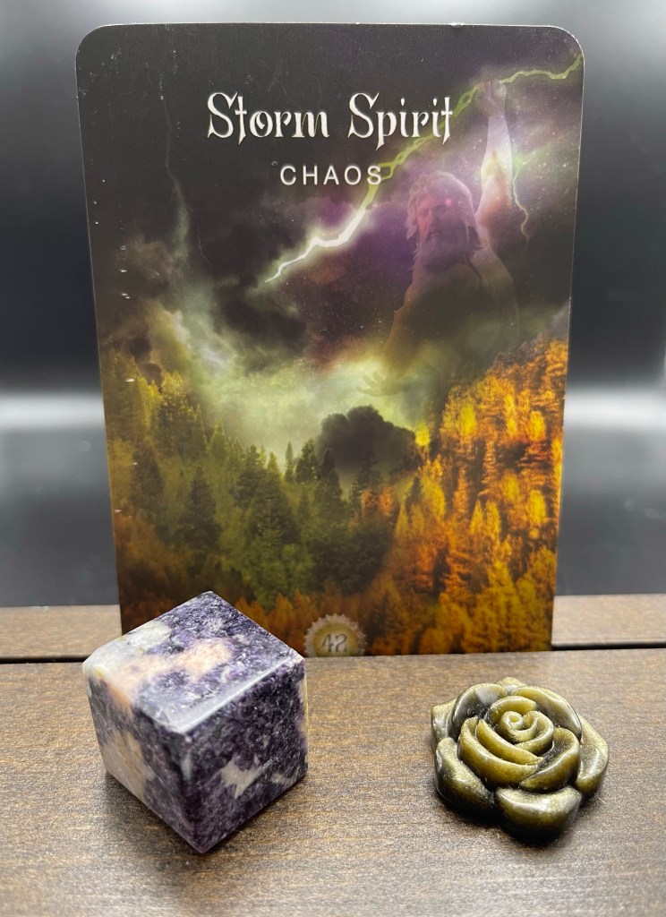 Storm Spirit comes in with the message that chaos and upheaval are not necessarily negative. There are times when the status quo needs to be shaken up, perhaps a change needs to happen and you have been resisting. Storms shake off the dead wood, bring the ground needed water and nitrogen atoms. All things that are needed in order to bring in new growth.