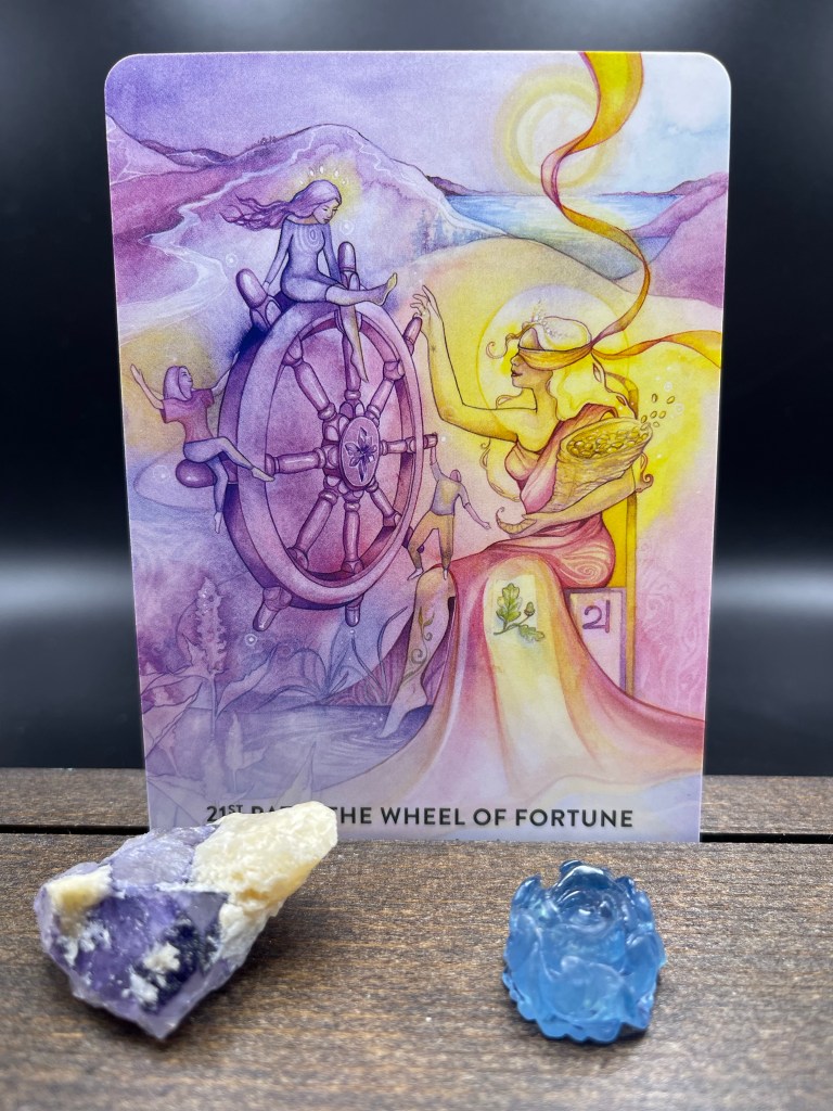 When the Wheel of Fortune shows up it’s time to get ready, opportunity is about to show up. It can pass you by if you aren’t ready. The Wheel of Fortune isn’t passive, you’re not going to have something just drop in your lap, that’s not how it works. The Wheel of Fortune rewards those who are working towards their goals; actively taking grounded action. If this is you, Wheel of Fortune rewards you with accelerated progress.